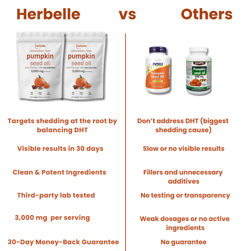 - Pumpkin Seed Oil + Saw Palmetto work together to naturally support healthy DHT levels — the hormone linked to shedding.